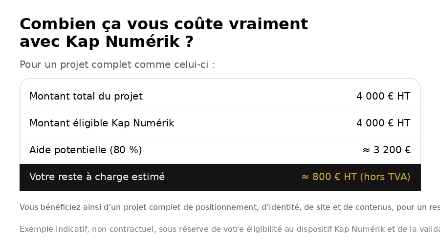 Je connais les plafonds, catégories et logiques du dispositif, ce qui me permet de concevoir un devis et une prestation optimisés pour vous : vous investissez dans un projet utile, et l’aide vient soulager la trésorerie.